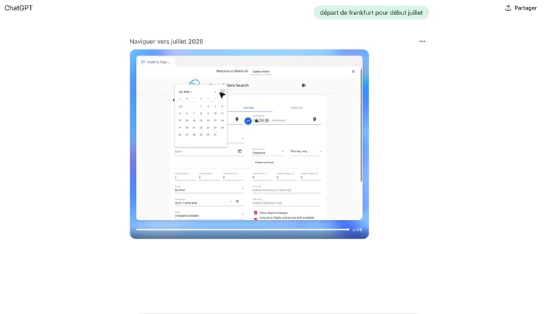 Une astuce ultra-pratique : vous pouvez demander à ChatGPT (en mode agent ou conversation avancée) de faire le travail à votre place sur ITA Matrix (matrix.itasoftware.com). Il vous suffit de lui partager le lien du site et d’indiquer ce que vous souhaitez faire — par exemple : « Trouve-moi le vol le moins cher en multi-city à cette période, depuis tel ou tel aéroport ».